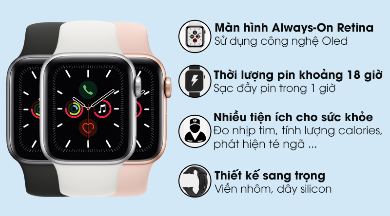 Apple Watch S5 44 mm là phiên bản nâng cấp nhẹ so với phiên bản Apple Watch S4 tiền nhiệm. Lần đầu tiên Apple Watch sẽ được trang bị màn hình OLED luôn bật, tính năng la bàn và khả năng cảnh báo khẩn cấp trên nhiều quốc gia hơn.